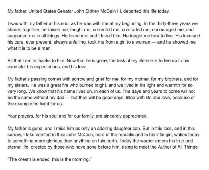 “Babai im, senatori i Shteteve të Bashkuar, John Sidney McCain III, u nda nga jeta sot. Isha me babin tim gjatë fundit të tij, ashtu siç ishte ai me mu në fillimet e mia. Në 33 vitet që ishim bashkë ai më rriti mua, më mësoi mua, më korrigjoi mua, më ngushëlloi mua, më jepte kurajo dhe më mbështeste në të gjitha gjërat. Ai më donte mua, dhe unë e doja atë. Ai më mësoi si të jetoj. Dashuria dhe kujdesi i tij ishin gjithmonë prezente dhe të pandërprera, ato më bën mua nga një vajzë në një grua – dhe ai më tregoi se çka është të qenurit mashkull.Për të gjitha këto unë i jam shumë falënderuese. Tani pasi që ai iku, detyra ime në jetë është të jetoj sipas shembullit të tij, pritshmërive të tij dhe dashurisë së tij.