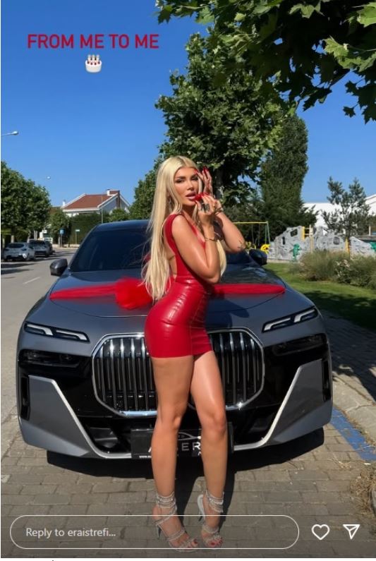 Përmes disa postimeve në InstaStory, Era ndau me ndjekësit momente nga dita e saj e veçantë, duke i falënderuar të gjithë për urimet dhe duke treguar surprizën që i kishte bërë vetes: një veturë BMW X7 e zezë, e zbukuruar me një fjongo të madhe të kuqe.