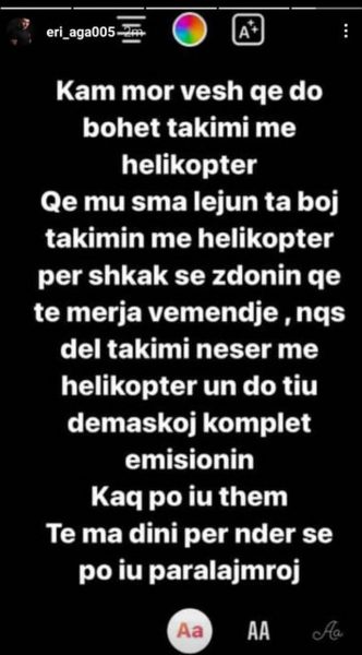 “Kam marr vesh që do bëhet takimi me helikopter, që mua s’ma lejuan ta bëj takimin me helikopter për shkak se s’donin që të merrja vëmendje, nëse del takimi nesër me helikopter unë do t’ju demaskoj komplet emisionin. Kaq po ju them. Të ma dini për nder se po ju paralajmëroj”, shkruan Eri.