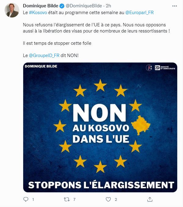 “Kosova ishte në program këtë javë në Parlamentin Evropian në Francë. Ne refuzojmë zgjerimin e BE-së me këtë vend. Ne gjithashtu kundërshtojmë lëshimin e vizave për shumë shtetas të tyre! Është koha për të ndaluar këtë çmenduri. Grupi i Identitetit dhe Demokracisë – Francë thotë JO”, ka shkruar ajo në Twitter.