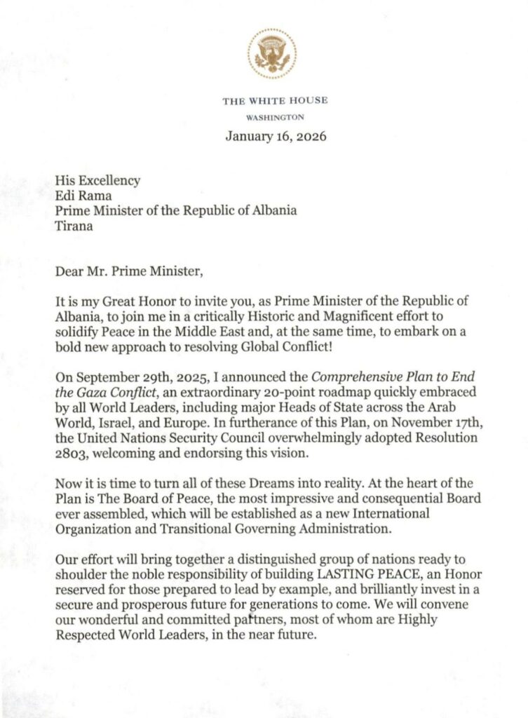 Presidenti i Shteteve të Bashkuara të Amerikës Donald Trump, i ka dërguar një ftesë personale kryeministrit të Shqipërisë Edi Rama, për t’u bërë pjesë e Bordit të Paqes të ngritur për rindërtimin e Gazës.