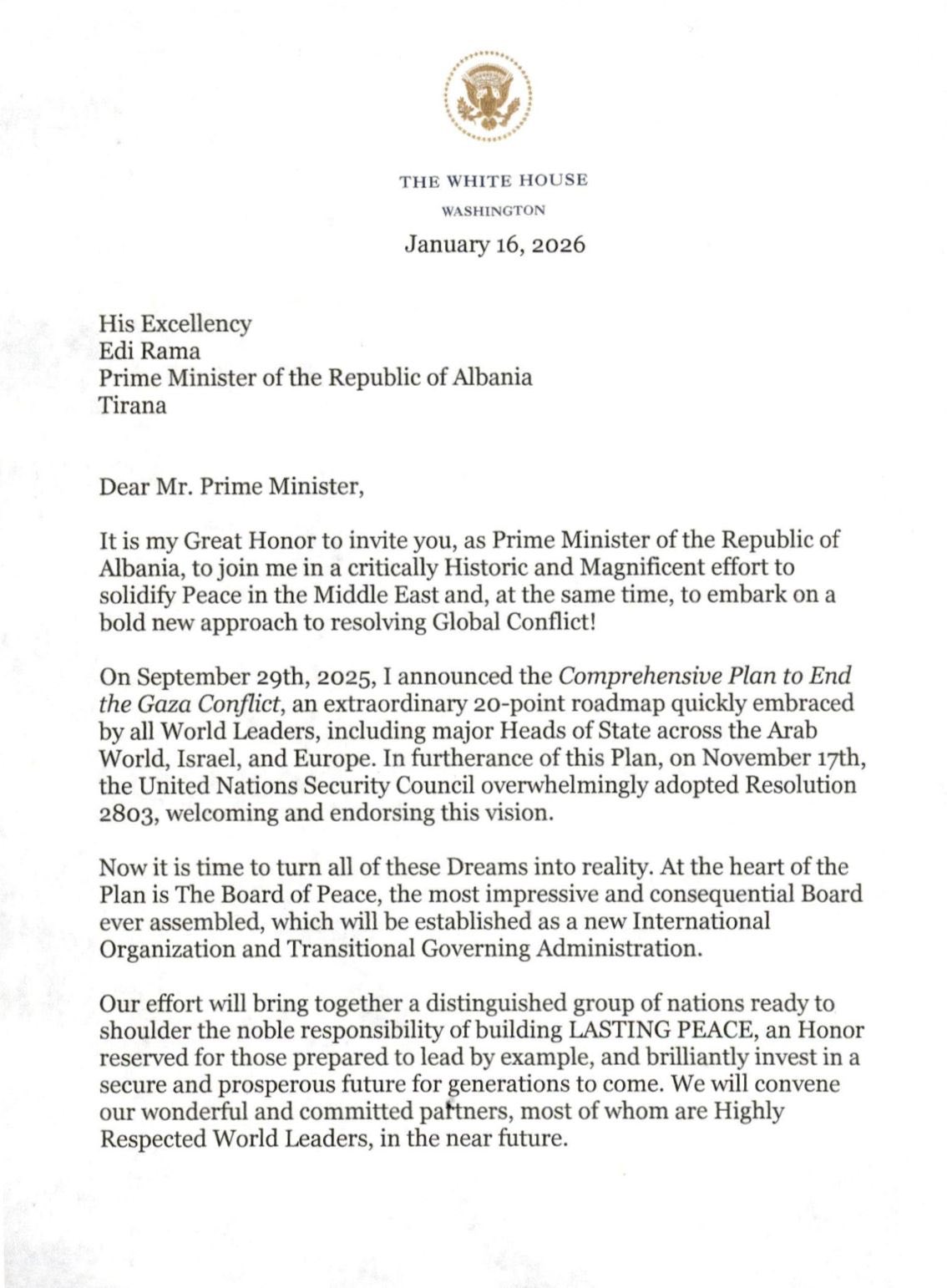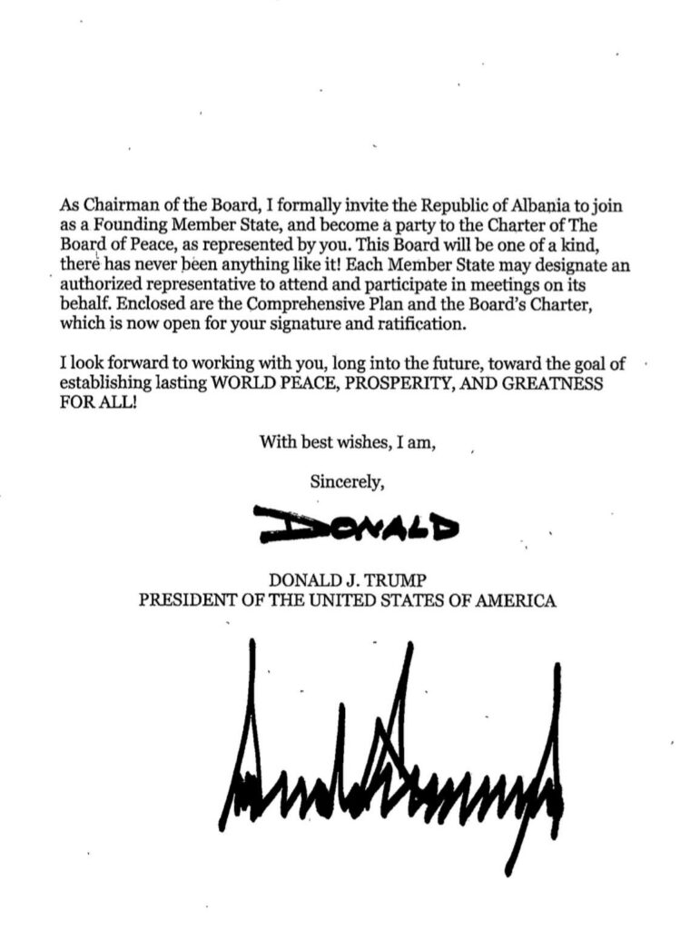 “Është një nder i madh për mua t’ju ftoj ju, si Kryeministër i Republikës së Shqipërisë, të më bashkoheni në një përpjekje Historike dhe Madhështore për forcimin e Paqes në Lindjen e Mesme dhe, njëkohësisht, të ndërmarrim një qasje të re plot guxim për zgjidhjen e Konfliktit Global!”, ka shkruar Trump në letrën drejtuar Ramës.