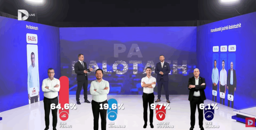 Sipas të dhënave të publikuara, LDK kryeson me 64.6 për qind të votave, duke lënë pas me diferencë të madhe kandidatin e Partisë Demokratike të Kosovës (PDK), Ali Nimanaj, i cili ka marrë 19.6 për qind. Në vendin e tretë renditet Astrit Bujupaj nga Lëvizja Vetëvendosje (LVV) me 9.7 për qind, ndërsa Ukë Blakaj nga Aleanca për Ardhmërinë e Kosovës (AAK) ka marrë 6.1 për qind të votave.