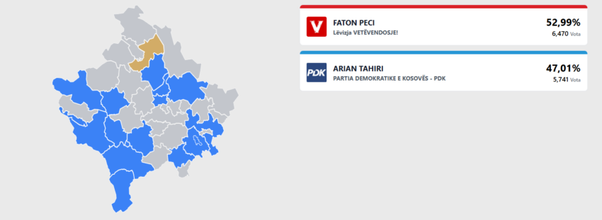 Kandidati i LVV-së për kryetar të Komunës së Mitrovicës së Jugut, Faton Peci rezulton të jetë i pari sipas rezultateve të KQZ-së. Sipas numërimit të KQZ-zë, Peci ka 6 mijë e 470 vota, apo 52.99 për qind.