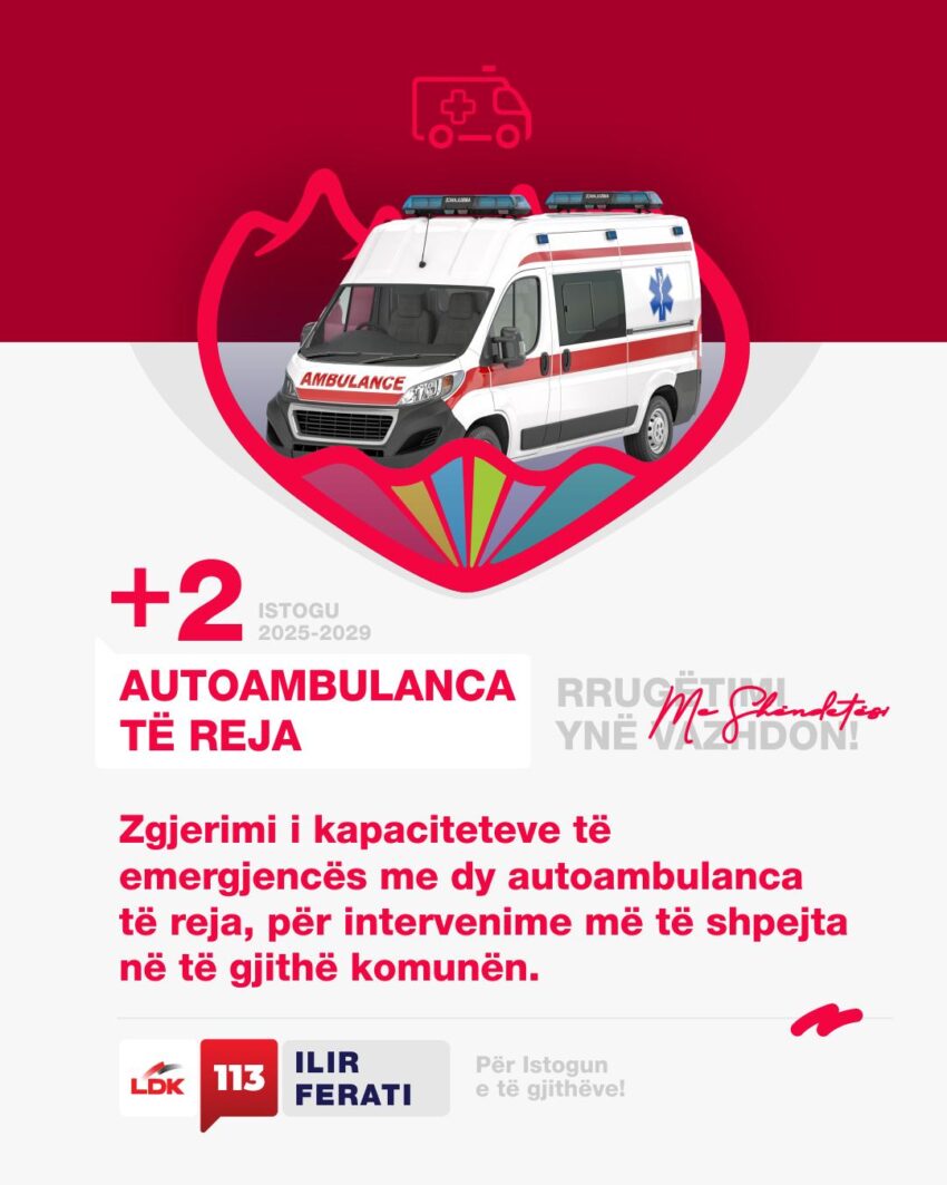 Kryetari i Komunës së Istogut, nga radhët e LDK-së, Ilir Ferati ka njoftuar se tashmë janë edhe shtuar edhe dy autoambulanca për intervenime më të shpejta dhe shërbime më të sigurta.