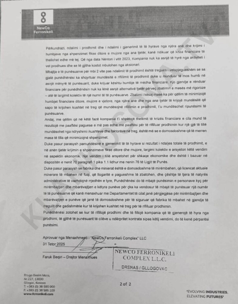 Ndër të tjera është përmendur edhe pushimi i aktiviteteve prodhuese, për shkak të rritjes së kostove, sidomos rritjes së çmimit të energjisë elektrike, e cila ka ndikuar negativisht në pozitën financinare, theksohet në dokument, njofton Klankosova.tv.