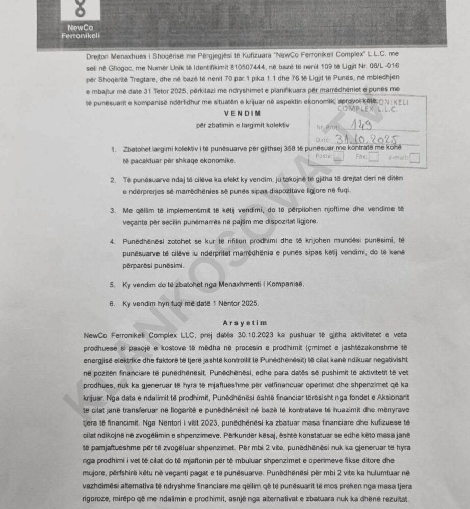 Drejtori menaxhues e aprovoi vendimin për zbatimin e largimit kolektiv të këtyre të punësuarve, i cili ka hyrë në fuqi më 1 nëntor.