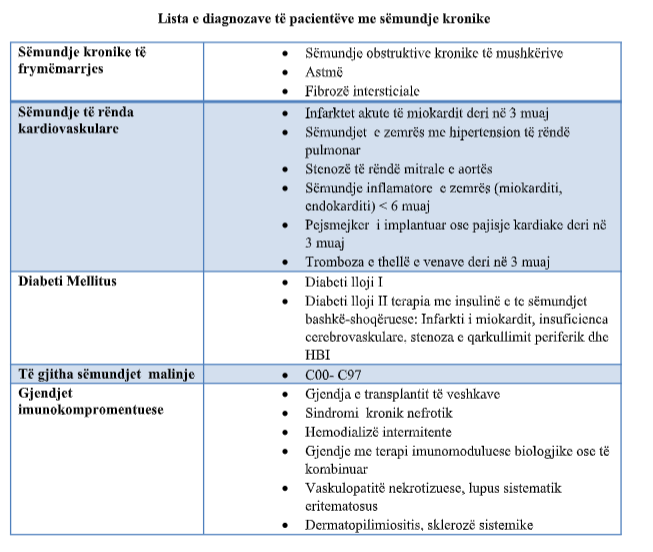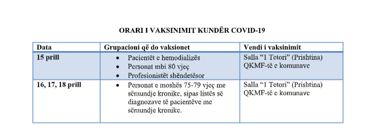 Komiteti për vaksinim kundër COVID-19 njofton se nga sot për disa ditë me radhë, në Prishtinë dhe në të gjitha komunat, do të fillojë vaksinimi i personave të moshës 75-79 vjeç me sëmundje kronike, sipas listës së diagnozave të pacientëve me sëmundje kronike, të dëshmuar me raport mjekësor me rastin e paraqitjes për vaksinim.