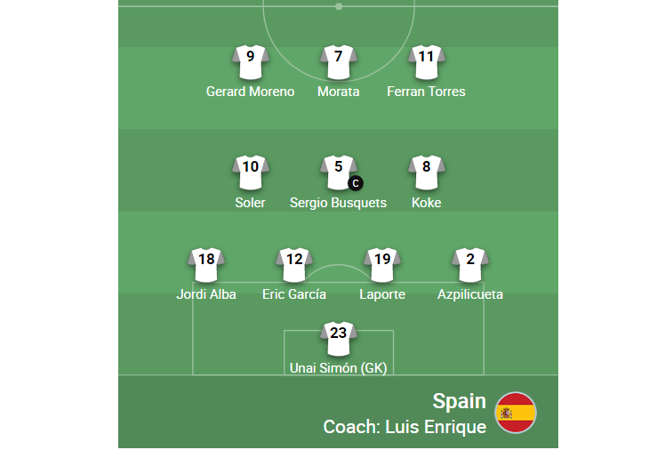 Nga minuta e parë për Suedinë sonte në sulm kanë startuar: Kulusevski dhe Isak, kurse për Spanjën në sulm sonte kanë startuar: Gerard Moreno, Morata dhe Ferran Torres.