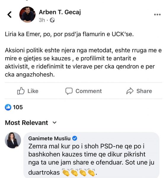 Në statusin e Gecajt në Facebook, ku ka shkruar për aksionin e PSD’së, Musliu ka komentuar se ajo dikur është sharë e ofenduar nga kjo parti, por sot e duartroket.