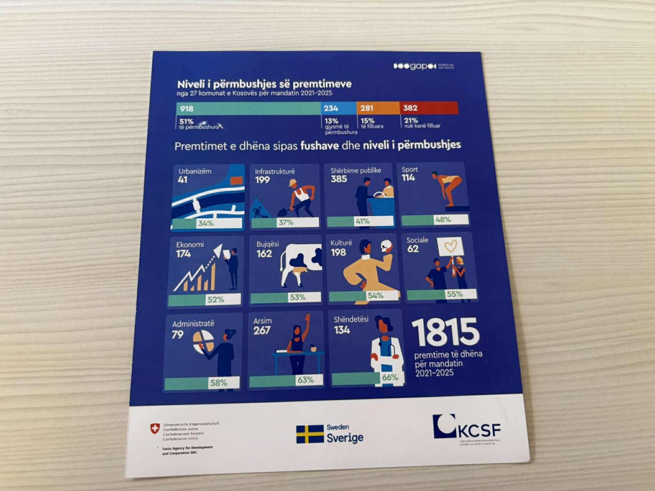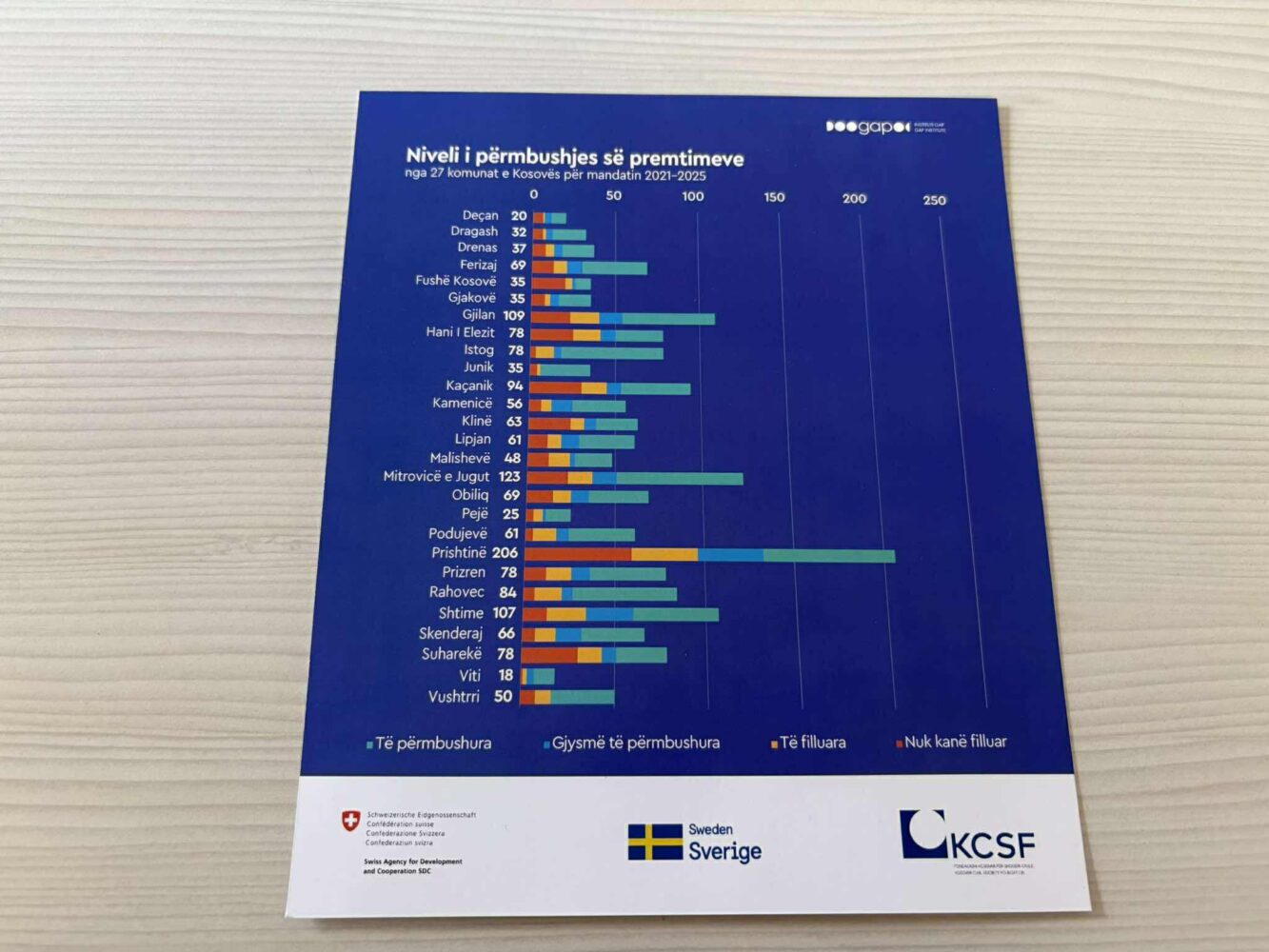 Instituti GAP ka prezantuar të martën një raport mbi përmbushjen e premtimeve nga kryetarët e komunave të Kosovës gjatë mandatit 2021–2025, ku rezulton se vetëm gjysma e tyre janë realizuar, raporton Ekonomia Online.