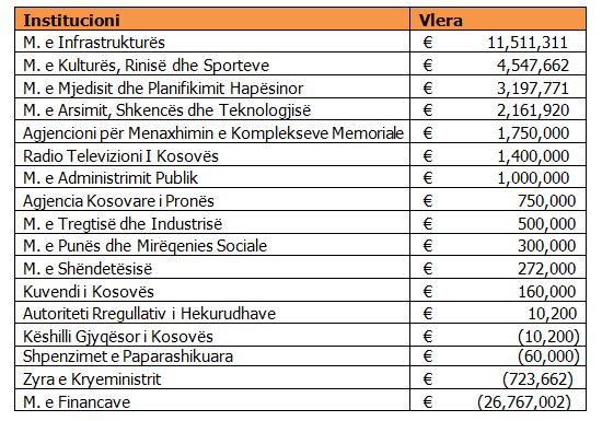 Këshillit Gjyqësor të Kosovës i është ulur kufiri i shpenzimeve për 10,200 euro në kategorinë e pagave dhe mëditjeve, ndërsa këto mjete janë bartur tek Autoriteti Rregullativ i Hekurudhave për rritjen e numrit të stafit për katër persona.