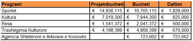 Pas MI-së, Ministria e Kulturës, Rinisë dhe Sportit (MKRS)  është ministria e cila ka përfituar më së shumti nga ndryshimet në buxhet. Buxheti i kësaj ministrie është rritur për 4.5 milionë euro (16%). Shumica e rritjes (84%) shkon për investime kapitale, ndërsa nga kjo rritje 40% (1.8 milionë euro) i dedikohen sporteve. Një ndryshim strukturor sa i përket MKRS-së,  është se Agjencia Shtetërore e Arkivave ka kaluar nën menaxhimin e MKRS-së nga Zyra e Kryeministrit.