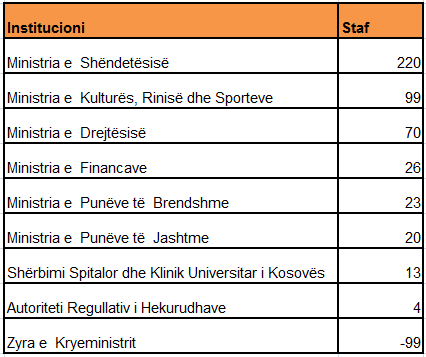 Megjithëse buxheti për kategorinë e pagave dhe mëditjeve nuk është rritur, në këto institucione është rritur numri i lejuar i punëtorëve: Shërbimi Korrektues i Kosovës- Ministria e Drejtësisë; Administrata Tatimore e Kosovës – Ministria e Financave; Inspektorati Policor i Kosovës- Ministria e Punëve të Brendshme; Ambasadat – Ministria e Punëve të Jashtme; dhe Shërbimi Spitalor dhe Klinik Universitar i Kosovës. Gjithashtu në Ministrinë e Shëndetësisë, 220 persona nga programi për specializime që në projektbuxhet janë planifikuar të paguhen nga kategoria e subvencioneve, kanë kaluar në kategorinë e pagave dhe mëditjeve.