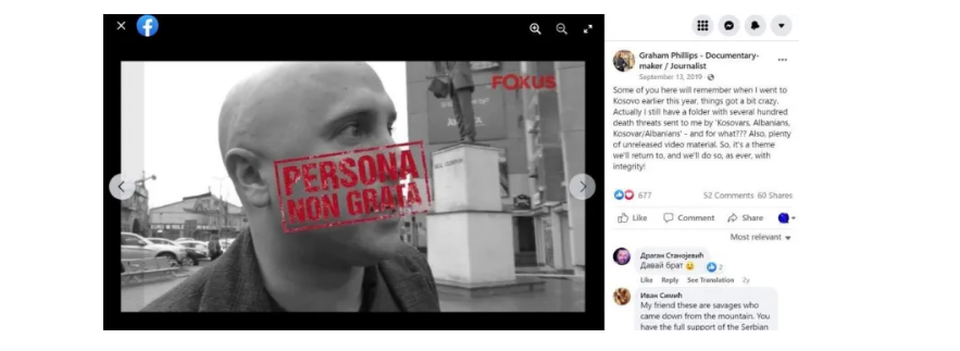 Graham Philips kishte bërë disa reportazhe në Kosovë ku thoshte se “Kosova si shtet i ri është rezultat i spastrimit etnik të serbëve”.