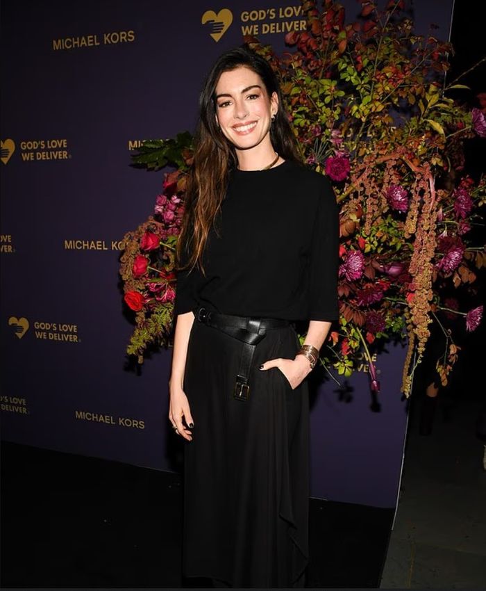 Anne Hathaway, 42 vjeçe, zgjodhi një pamje të zezë klasike me bluzë të gjerë dhe fund të gjatë, duke shtuar shkëlqim me byzylykë argjendi, shkruan DailyMail.