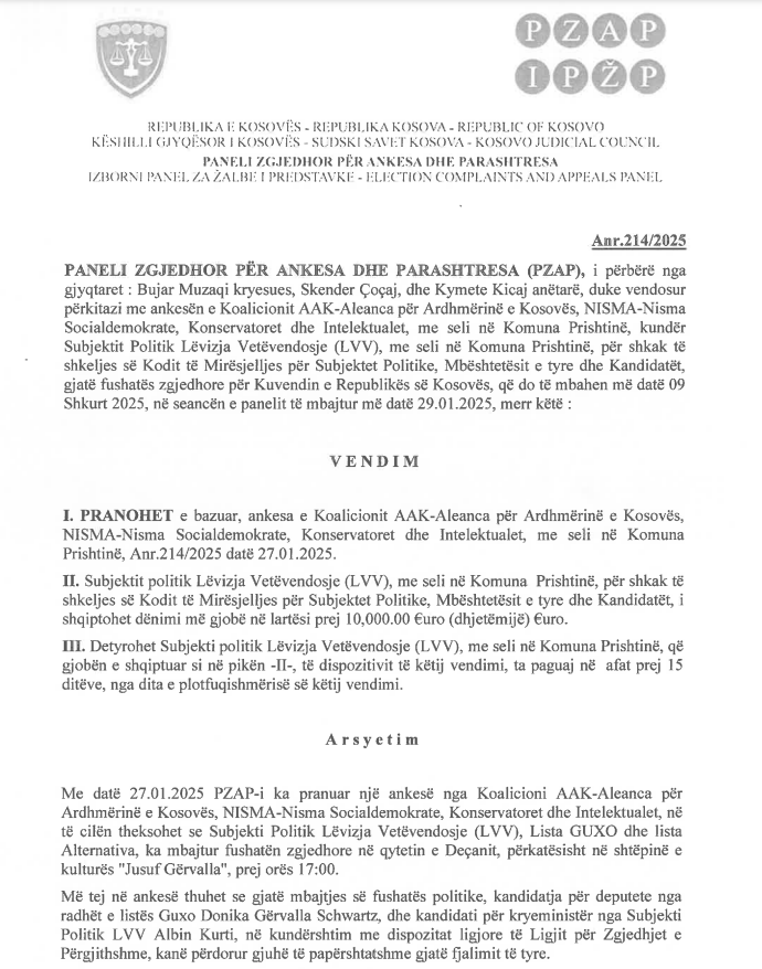 Paneli Zgjedhor për Ankesa dhe Parashtresa e ka gjobitur Lëvizjen Vetëvendosje me 10 mijë euro për deklaratat e Donika Gërvallës për kreun e AAK’së, Ramush Haradinajn, gjatë një tubimi në Deçan.