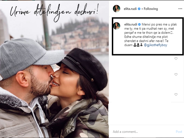 Elita ka publikuar në profilin e saj të Instagramit, një foto në të cilën shihet duke u puthur me Gjikon. “Mezi po pres të plakem me ty, të t’i shoh rrudhat poshtë syve, të të përqafoj dhe të të them se ia dolëm! Dhe shume ditelindje me plot shendet e dashuri afer nesh!! Te duam”, shkruan moderatorja krahas fotos.