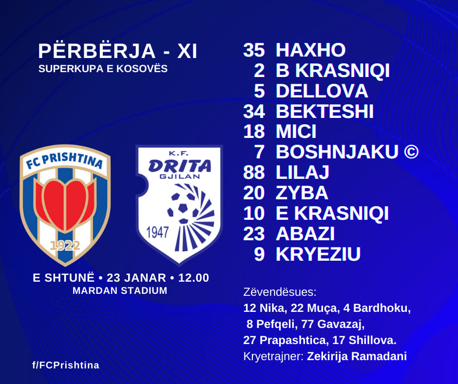 Gjithçka është gati për ndeshjen e Superkupës së Kosovës në futboll mes Prishtinës dhe Dritës, e cila nis nga ora 12:00 me kohën tonë lokale.