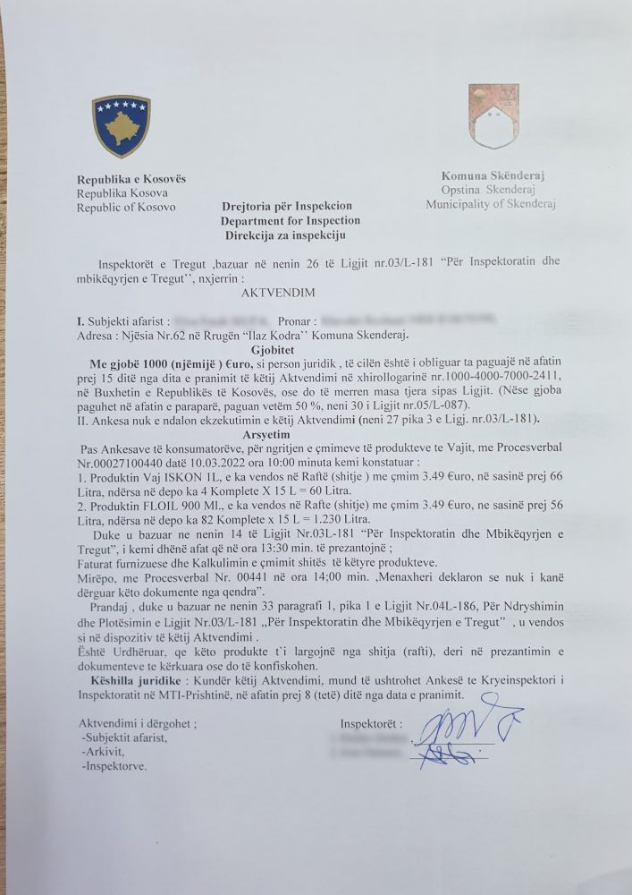 Komuna ka gjobitur biznesin me 1 mijë euro, pasi ngriti çmimin e vajit në 3 euro e 49 centë.
