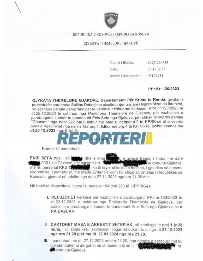 Në aktvendimin e siguruar nga Gazeta online Reporteri.net, bëhet e ditur se është refuzuar kërkesa e Prokurorisë Themelore në Gjakovë për vazhdimin e paraburgimit për policin Enis.S, dhe i njëjti është liruar në arrest shtëpiak në kohëzgjatje prej një muaj.