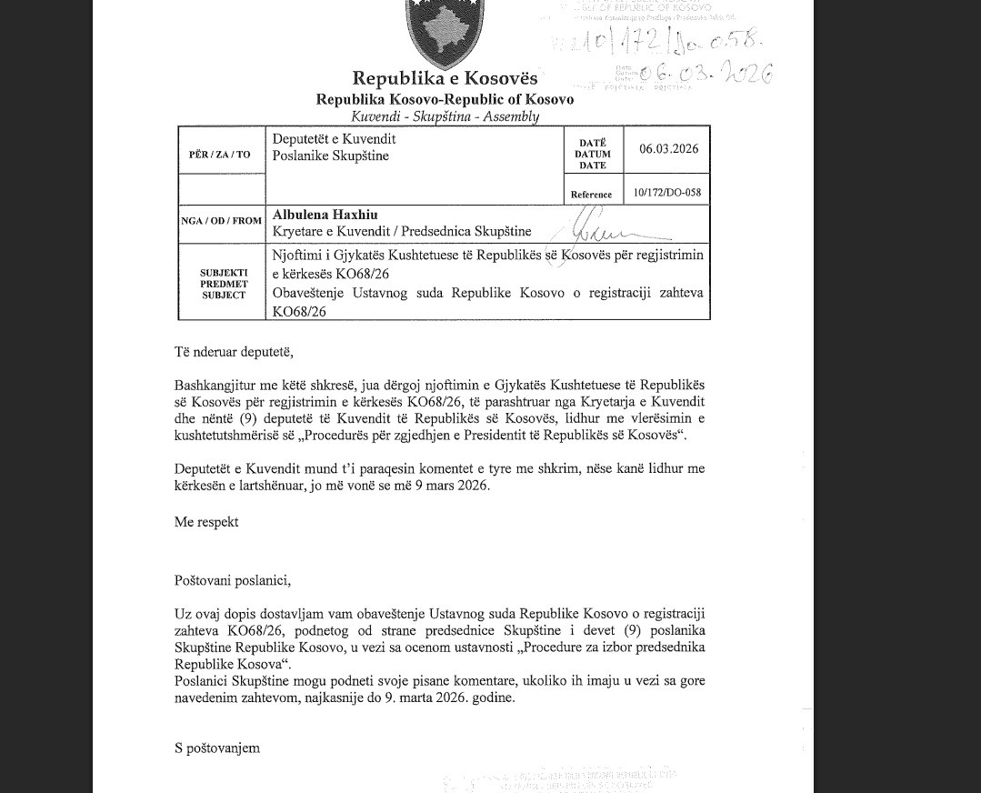 Përmes një shkrese kjo gjykatë e ka njoftuar Haxhiun se ka regjistruar kërkesën K.068/26, e cila është parashtruar nga ajo dhe 9 deputetë të Kuvendit të Kosovës. lidhur me vlerësimin e kushtetutshmërisë së “Procedurës për zgjedhjen e Presidentit të Republikës së Kosovës”.