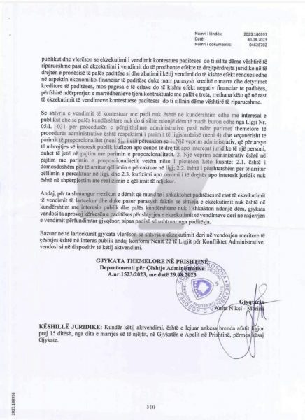 T7 ka siguruar vendimin e Gjykatës Themelore i cili shtynë vendimin e Ministrisë së Bujqësisë për lirimin e pronës deri kur gjykata të vendos me vendim përfundimtar përkitazi me kërkesëpadinë e paditëses.
