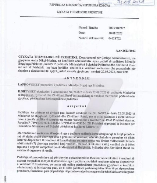 Gjykata Themelore në Prishtinë ka marrë vendim për shtyrje të vendimit të ministrit Faton Peci i cili kishte urdhëruar familjen Bogaj të lëshonte një pronë në rrugën “Dëshmorët e Kombit” me pretendimin se është pronë e Ministrisë së Bujqësisë.