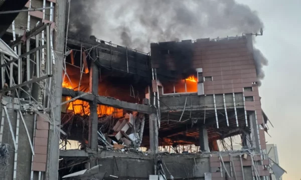 Një pjesë e madhe e ndërtesës, e vendosur në kryeqytetin Teheran, duket se është dëmtuar rëndë dhe brenda saj shihet një zjarr.