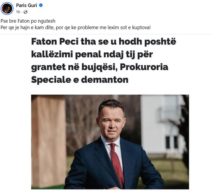 Guri, në një postimi në profilin e tij në rrjetin social Facebook, ka shkrua se e ka ditur që Faton Peci për siç ka thënë ai është hajn, por që ka probleme me leximin e ka kuptuar tani.