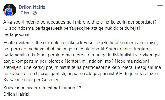 “A ka sporti ndonje perfaqesues qe i mbrone dhe e ngrite zerin per sportistet? … apo ndoshta perfaqesuesit perfaqesojne ata qe nuk do te duhej t’i perfaqesonin! Eshte evidente dhe normale qe fokusi kryesor te jete lufta kunder pandemise, por permes mediave shoh se sa jetim eshte sporti! Shoh qendrat tregtare, parlamentin e kafenet perplote me njerez, e mua qe individualisht stervitem pa asnje kompenzim per lojerat e Nentorit m’i ndaloni ato? Nese ma ndaloni stervitjen, une kerkoj prej ministrit te na perfaqesoi ne keto lojera. Besoj shume ne kapacitetin e tij prej sportisti, aq sa ne ate prej ministri! E di qe nuk refuzon! Ky sakrifikohet per Ceshtjen! Suksese minister e meshnet numrin 12, Drilon Hajrizi”, ka shkruar basketbollisti i Pejës.