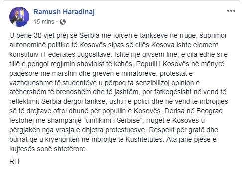 “ Derisa në Beograd festohej me shampanjë “unifikimi i Serbisë”, rrugët e Kosovës u përgjakën nga vrasja e dhjetra protestuesve. Respekt për gratë dhe burrat që u kryengritën në mbrojtje të Kushtetutës. Ata janë pjesë e kujtesës sonë shtetërore”, shkruan Haradinaj në rrjetin social Facebook.