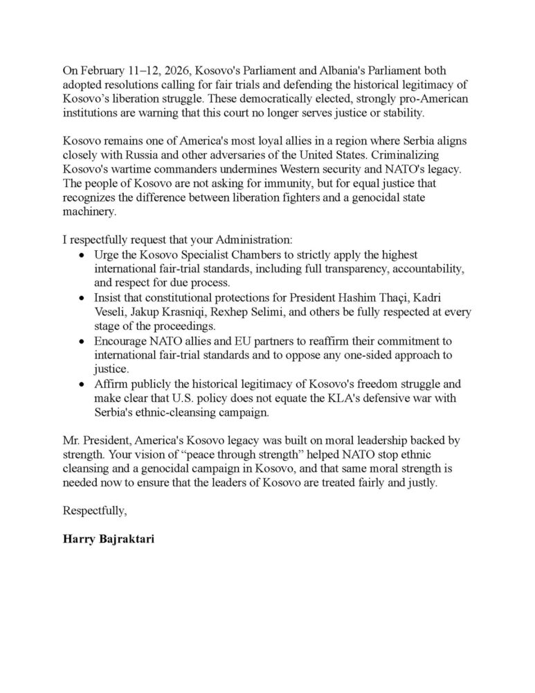 “Si qytetar amerikan dhe përfaqësues i komunitetit shqiptaro-amerikan, sot i kam dërguar një letër zyrtare Presidentit Donald J. Trump, ku kam shprehur shqetësimin tim lidhur me Gjykatën Speciale dhe domosdoshmërinë që Shtetet e Bashkuara të angazhohen për t’u siguruar që ky mekanizëm të garantojë një gjykim të drejtë për ish-udhëheqësit e Kosovës — Hashim Thaçin, Kadri Veselin, Jakup Krasniqin, Rexhep Selimin — dhe për të tjerët që po mbahen në Hagë”, ka shkruar ai.