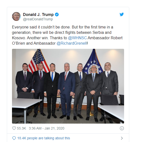 “Të gjithë thoshin se nuk bëhej dot. Por, për herë të parë në një gjeneratë do të ketë fluturime të drejtpërdrejta midis Serbisë dhe Kosovës. Një tjetër fitore”, kishte shkruar presidenti Trump.
