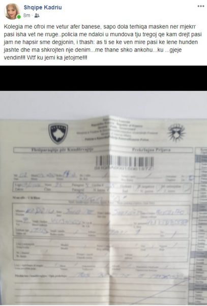 “Kolegia me ofroi me veturë afër banese, sapo dola tërhiqa maskën nër mjekërr pasi isha vet në rrugë. Policia me ndaloi u mundova t’iu tregojë që kamë drejtë pasi jam në hapsirë nuk më dëgjonin/ U thash, as ti s’e paske të vendosur maskën mirë pasi e ke lënë hundën jashtë.. dhe ma shkruan dënimin. Më thanë shko ankohu ku të mundesh. Ëtf se ku jetojmë”, ka shkruar ajo.