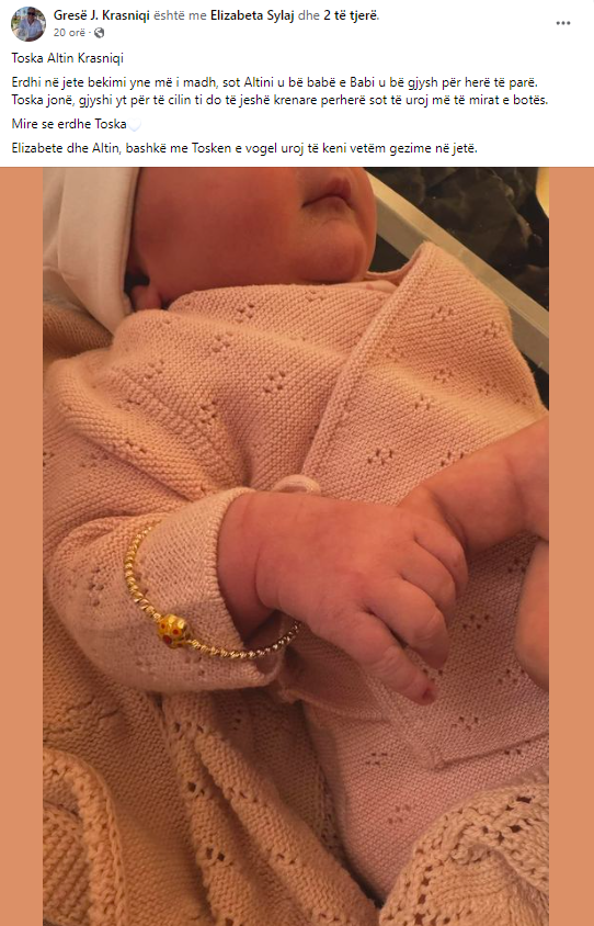 “Erdhi në jete bekimi ynë më i madh, sot Altini u bë babë e Babi u bë gjysh për herë të parë. Toska jonë, gjyshi yt për të cilin ti do të jesh krenare përherë sot të uroj më të mirat e botës”, ka shkruar Gresë Krasniqi për mbesën e vet.