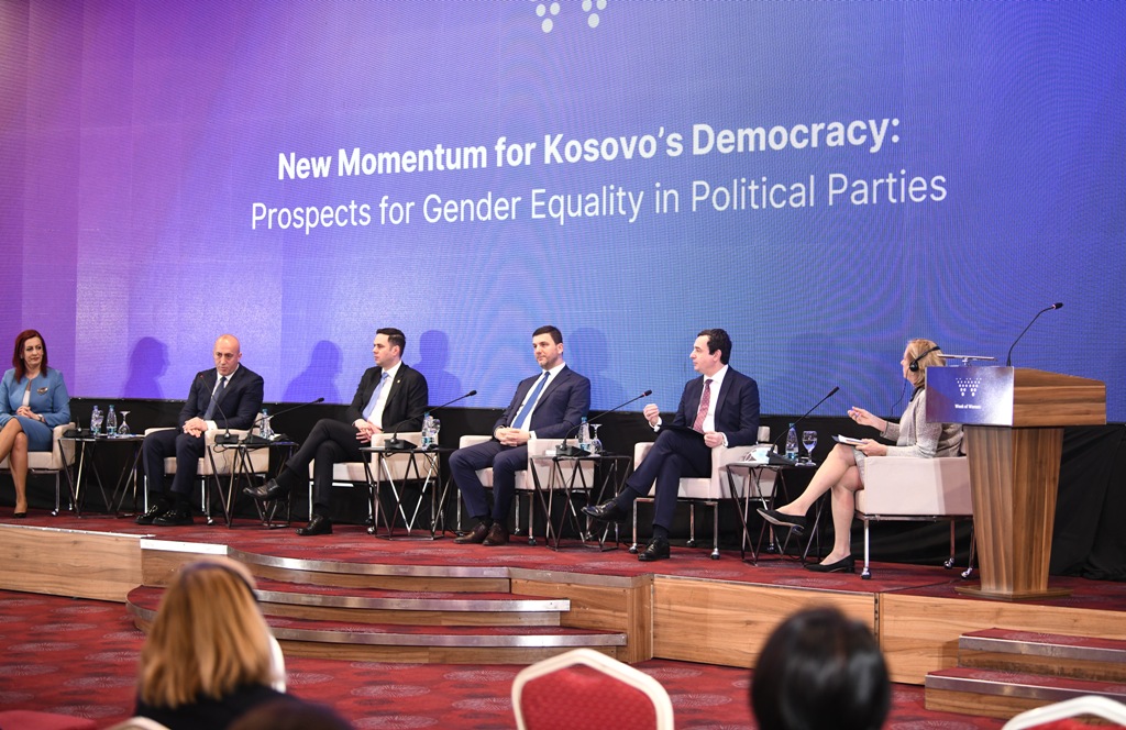 Paneli i parë i diskutimit, “Momentum i ri për demokracinë e Kosovës: Mundësitë për pjesëmarrje të barabartë gjinore në parti politike” të kësaj konference solli liderët e partive politike në Kosovë për të diskutuar rreth pjesëmarrjes së barabartë gjinore në parti politike. Të pranishëm në këtë panel ishin: Albin Kurti, kryetar i Lëvizjes Vetëvendosje (LVV); Memli Krasniqi, kryetar i Partisë Demokratike të Kosovës (PDK); Lumir Abdixhiku, kryetar i Lidhjes Demokratike të Kosovës (LDK); Ramush Haradinaj, kryetar i Aleancës për Ardhmërinë e Kosovës (AAK) dhe Emilija Rexhepi, kryetare e Partisë së Re Demokratike (NDS).