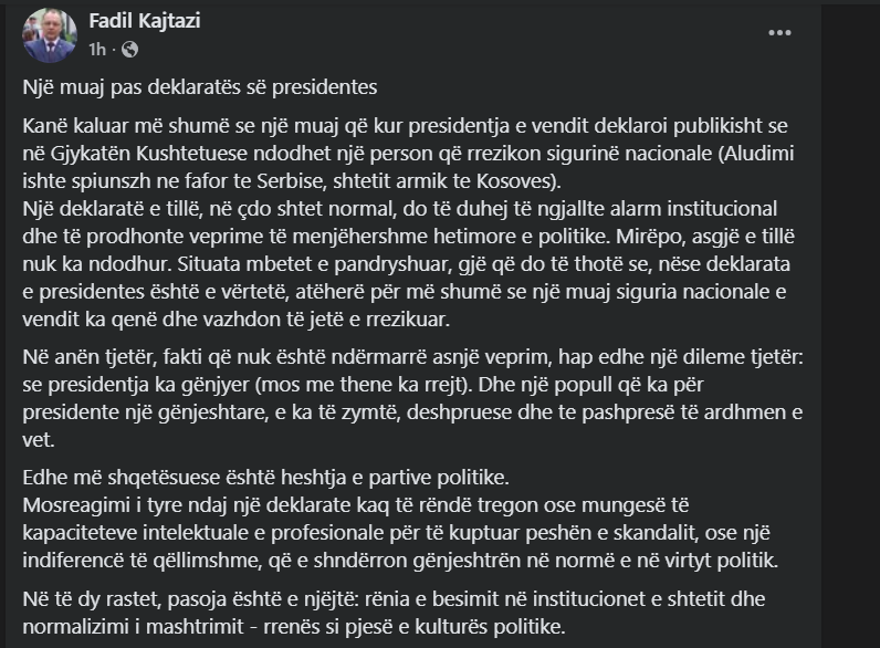 “Kanë kaluar më shumë se një muaj që kur presidentja e vendit deklaroi publikisht se në Gjykatën Kushtetuese ndodhet një person që rrezikon sigurinë nacionale (Aludimi ishte spiunazh ne favor te Serbise, shtetit armik te Kosoves). Një deklaratë e tillë, në çdo shtet normal, do të duhej të ngjallte alarm institucional dhe të prodhonte veprime të menjëhershme hetimore e politike. Mirëpo, asgjë e tillë nuk ka ndodhur. Situata mbetet e pandryshuar, gjë që do të thotë se, nëse deklarata e presidentes është e vërtetë, atëherë për më shumë se një muaj siguria nacionale e vendit ka qenë dhe vazhdon të jetë e rrezikuar. Në anën tjetër, fakti që nuk është ndërmarrë asnjë veprim, hap edhe një dileme tjetër: se presidentja ka gënjyer (mos me thene ka rrejt). Dhe një popull që ka për presidente një gënjeshtare, e ka të zymtë, deshpruese dhe te pashpresë të ardhmen e vet”, ka shkruar Kajtazi.