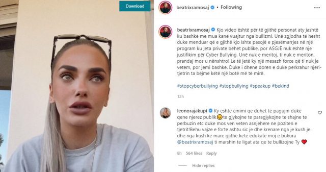 “Kjo video është për të gjithë personat aty jashtë ku bashkë me mua kanë vuajtur nga bullizmi. Unë zgjodha të hesht duke menduar që e gjithë kjo ishte pasojë e pjesëmarrjes në një program ku jeta private bëhet publike, por ASGJË nuk është një justifikim për Cyber Bullying.