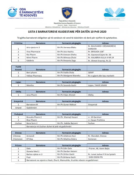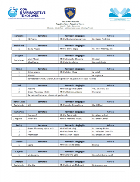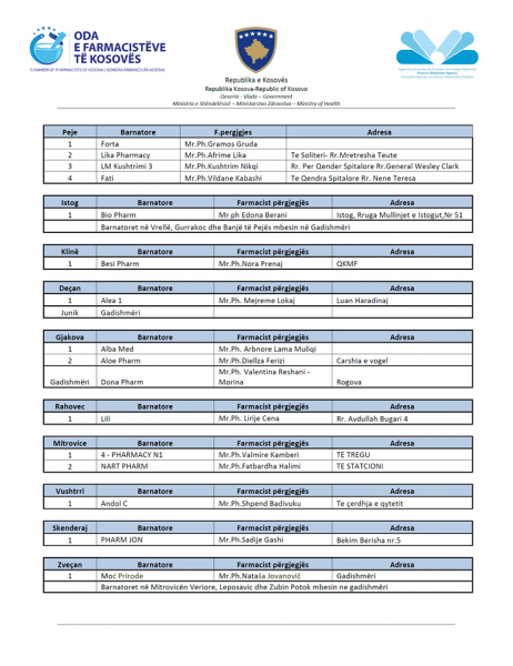 Ministria e Shëndetësisë, ka publikuar listën e barnatoreve kujdestare të ditës së sotme që do të punojnë pas orës 17:00 për të gjitha qytetet e Kosovës:
