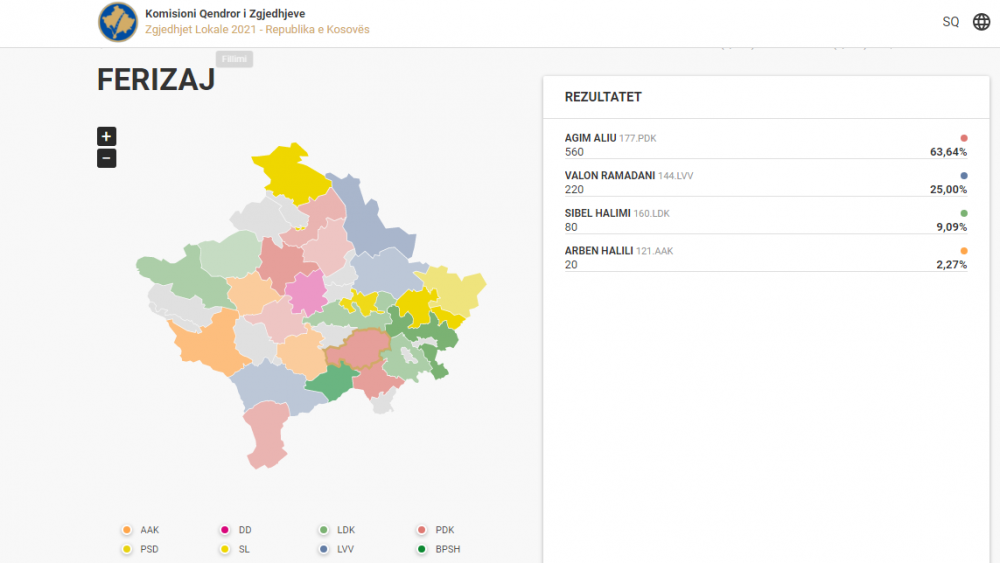 Deri në orën 19:51, sipas të dhënave të KQZ-së, në Ferizaj i pari me vota po prin Agim Aliu i Partisë Demokratike të Kosovës me 63.64% të votave, ose 560 vota.