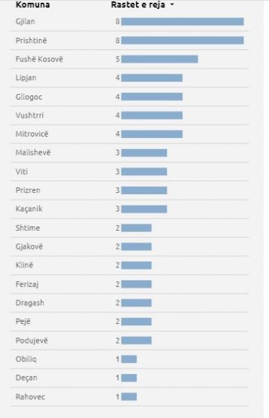 Komuna e Gjilanit dhe e Prishtinës prijnë me numrin më të madh të rasteve të reja me nga 8 raste, pastaj ajo e Fushë Kosovës me 5 raste, e Lipjanit me 4 dhe Gllogocit me 4.