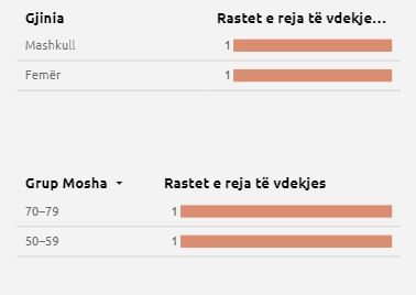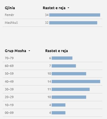 Viktimë gjatë kësaj kohe është një grua e moshës 50-59 vjeçare nga Peja dhe një burrë i moshës 70-79 vjeçare nga Obiliqi.
