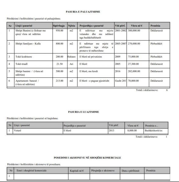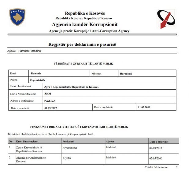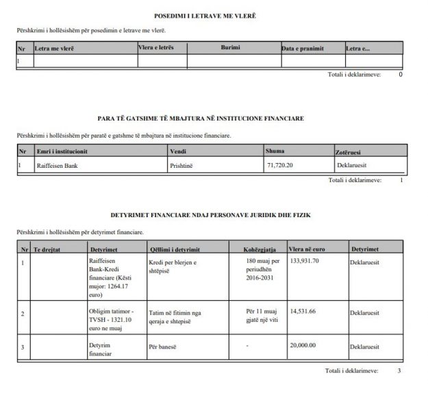 Ai ka edhe obligim tatimor në vlerë mbi 14 mijë euro, si dhe 20 mijë euro të tjera që i ka marrë kredi për banesë. Ndërkohë, që nuk i mungojnë as paratë e gatshme. Haradinaj ka deklaruar se i ka rreth 70 mijë euro para të gatshme në banka.