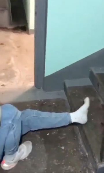 Ai ulet në fund të shkallëve dhe i vendos këmbët në shkallët. Pak sekonda më vonë, shoku i tij zbret nga shkallët dhe ulet në kofshën e tij duke plasaritur kockat. Rusi lëshon një ulërimë dhe përkulet në njërën anë me një dhimbje torturuese.