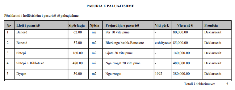 Dy banesat e Kokajt kushtojnë 80 mijë, përkatësisht 85 mijë euro. Një shtëpi 160 metra katror e Kokajt vlerësohet 140 mijë euro, ndërsa një shtëpi me bibliotekë (480 metra katror), ka deklaruar se kushton 480 mijë euro.