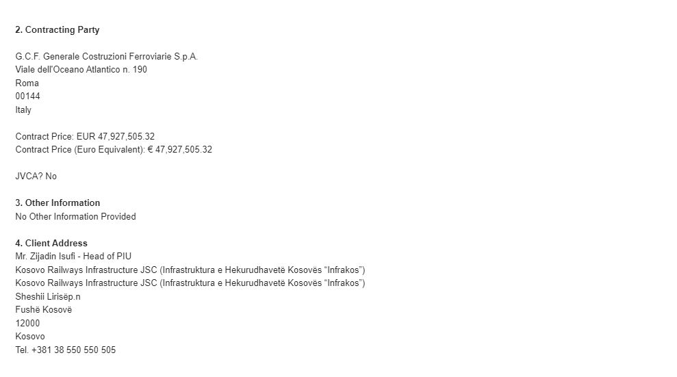 Vitin e kaluar ishte lidhur kontrata në mes BERZH dhe kompanisë “GCF Generale Costruzioni Ferroviarie SpA” në një vlerë prej 47,927,505.32 euro, por njoftimi publik ishte bërë në fund të vitit të kaluar.