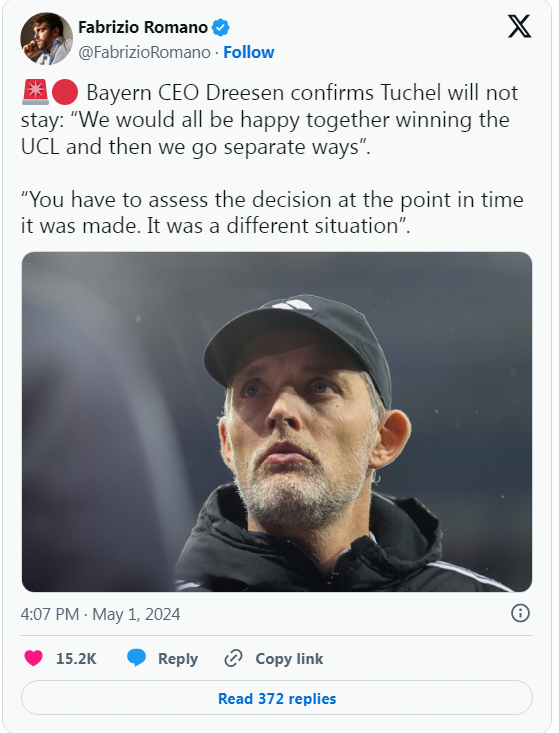 E Dreesen tha se Tuchel do të largohet nga klubi në fund të edicionit.