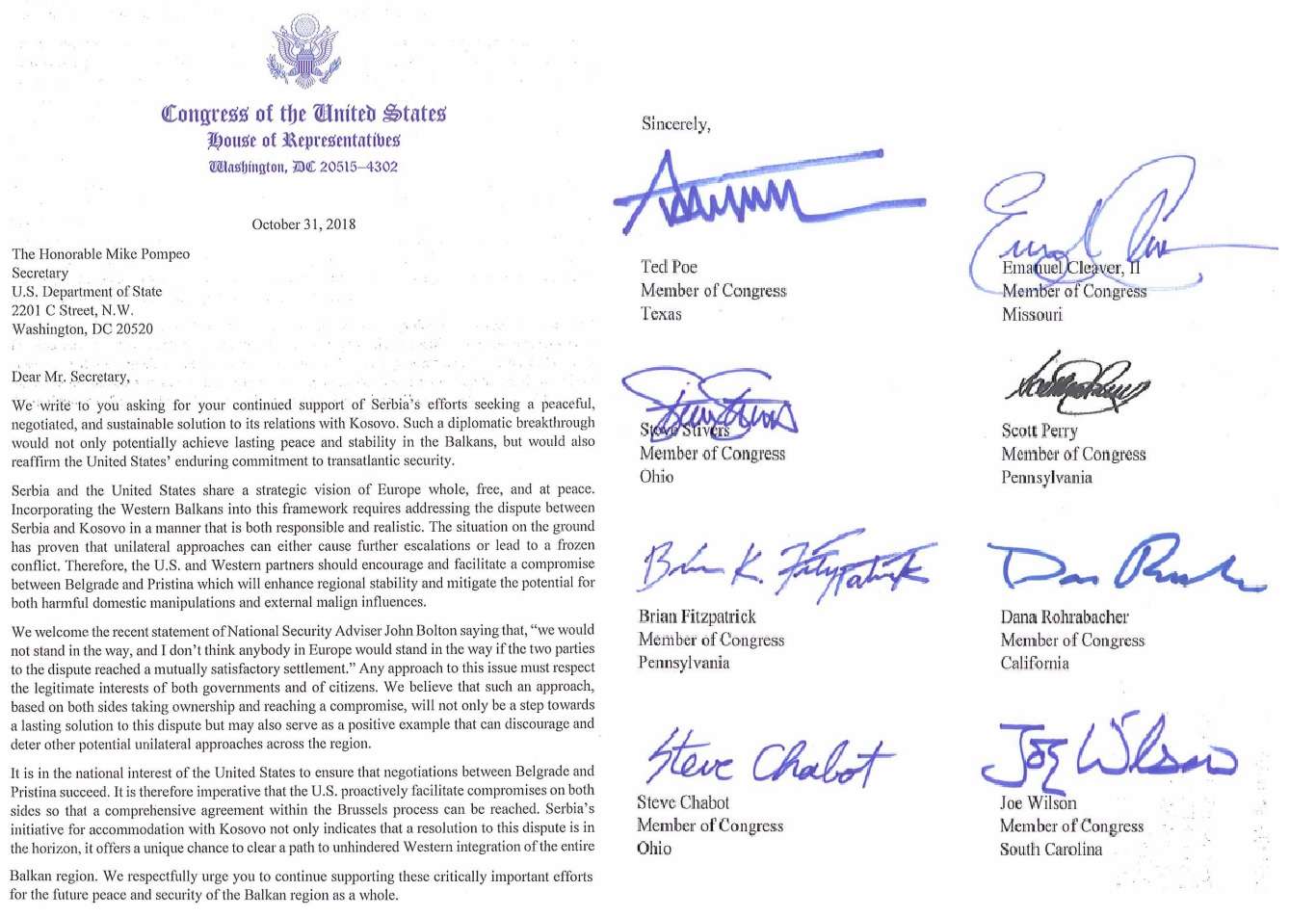 Tetë kongresmenë amerikanë kanë kërkuar nga Sekretari amerikan i Shtetit, Mike Pompeo, mbështetje të vazhdueshme ndaj siç thuhet, “përpjekjeve të Serbisë drejt kërkimit të një zgjidhjeje paqësore, të qëndrueshme dhe një zgjidhjeje që do të arrihej përmes negociatave në marrëdhëniet me Kosovën”.