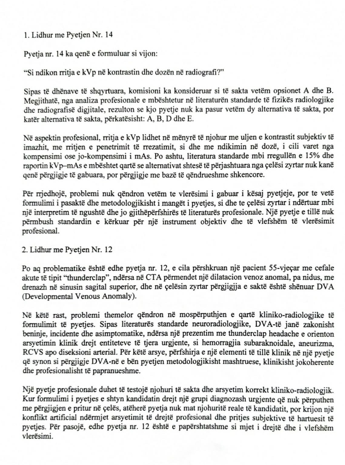 Në veçanti, kjo shoqatë thekson rastet e pyetjeve konkrete, si ato me numër 14 dhe 12, ku sipas analizës profesionale kanë ekzistuar më shumë alternativa të sakta sesa ato të pranuara nga komisioni vlerësues.